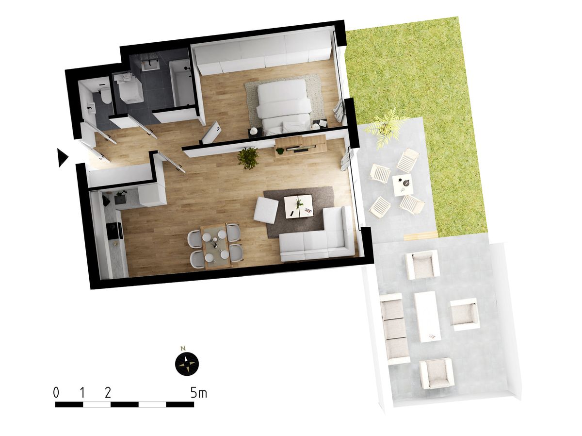 Das Herzstück bildet die helle Wohnküche mit direktem Zugang zur weitläufigen Terrasse – ein perfekter Ort, um entspannte Stunden im Freien zu genießen. Ergänzt wird das Raumangebot durch ein gemütliches Schlafzimmer, ein großzügiges Badezimmer mit Badewanne, Waschtisch und Waschmaschinenanschluss sowie ein separates WC mit Handwaschbecken.