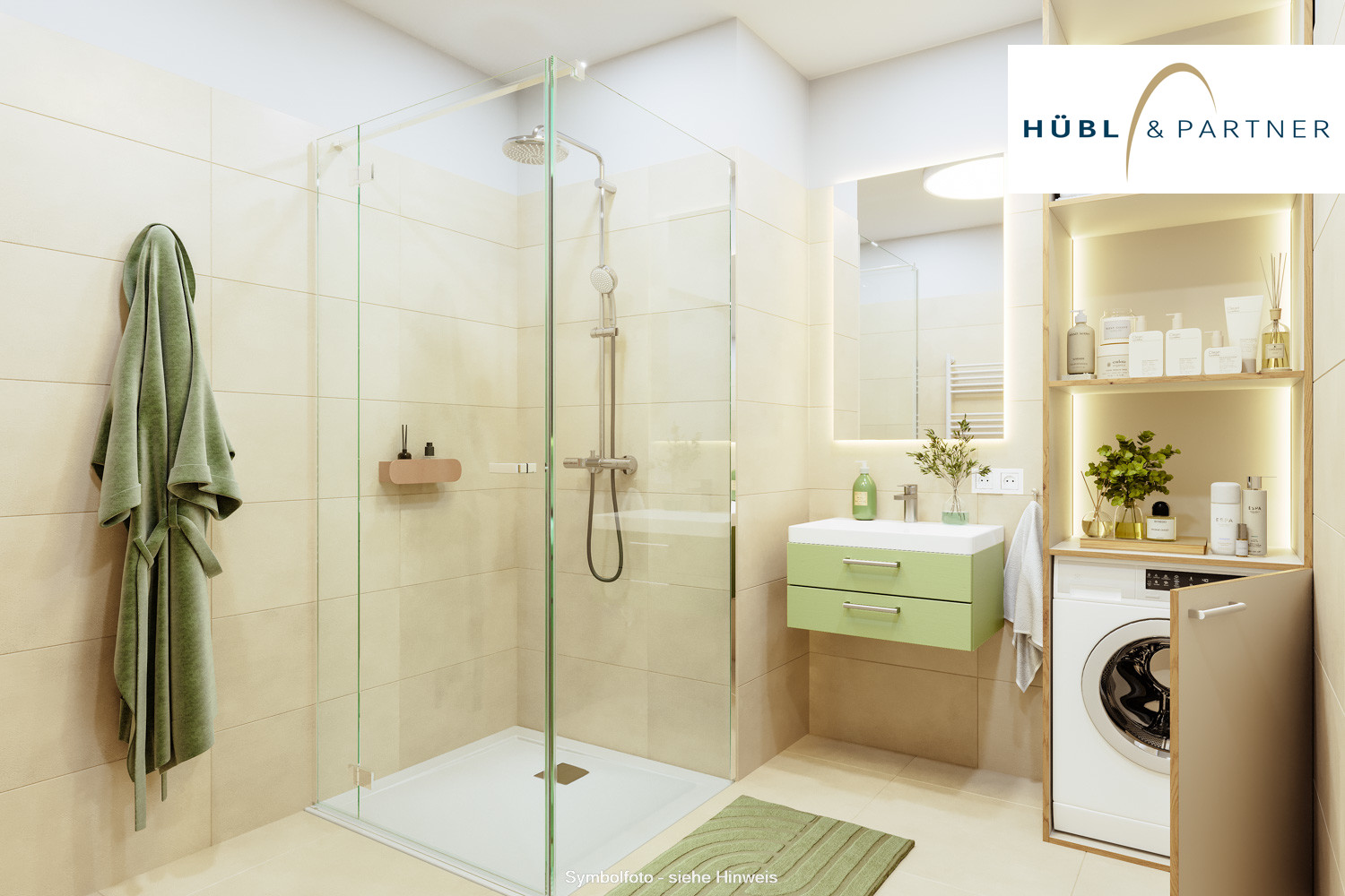- Die Bilder sind als Beispiele angeführt. Die Aufteilung der jeweiligen Wohnung ist dem Grundriss zu entnehmen. Sämtliche Visualisierungen sind Symboldarstellungen und müssen nicht der Wohnung entsprechen.