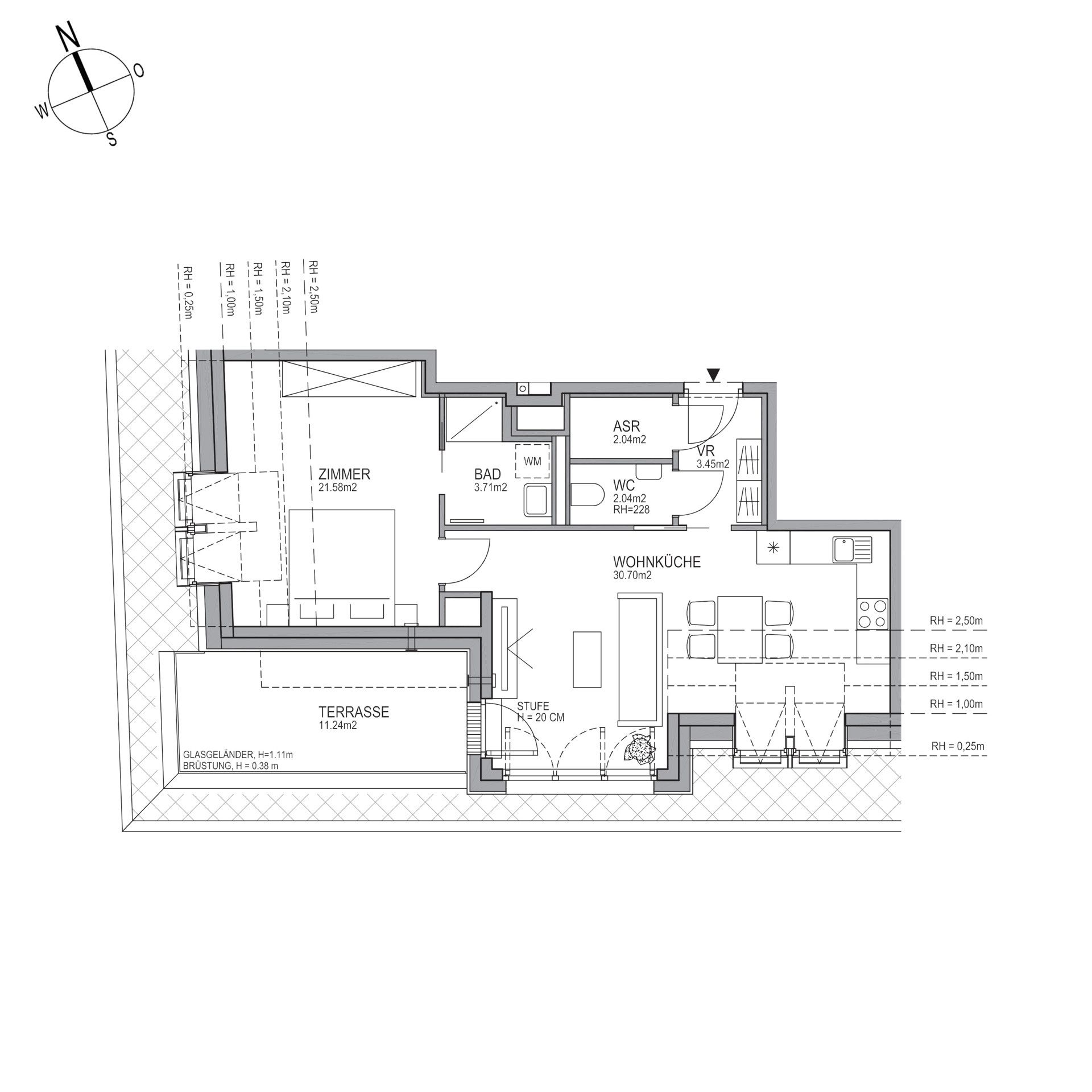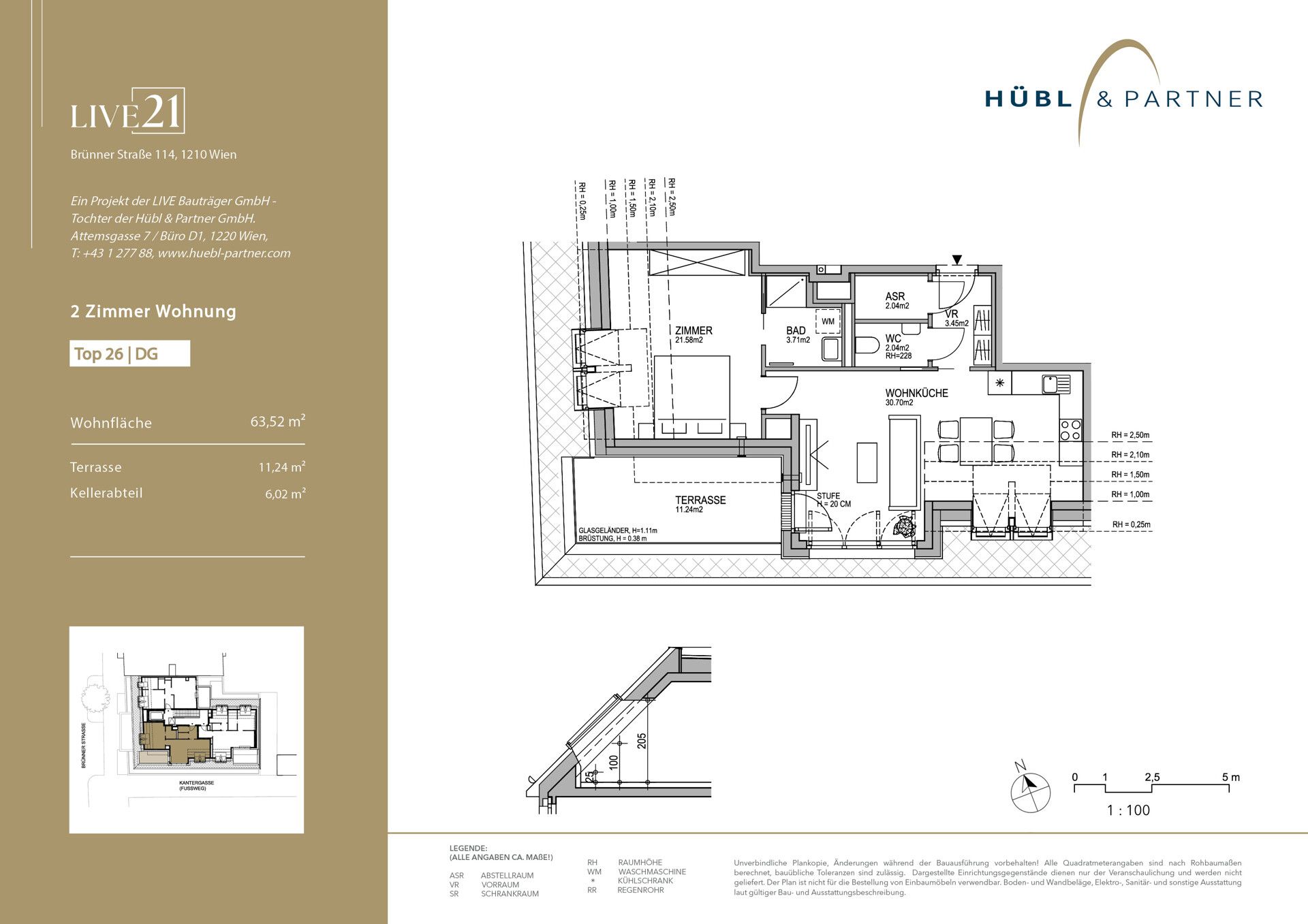 Im Dachgeschoß liegt diese klimatisierte wunderschöne 2-Zimmer Wohnung TOP 26 mit einer Wohnnutzfläche von 63,52 m². Den zentralen Mittelpunkt der Wohnung bildet die helle Wohnküche, diese ist direkt mit der großzügigen südwestlich ausgerichteten Terrasse. Das geräumige Schlafzimmer ist zentral begehbar. Das moderne Bad mit Dusche und Waschmaschinenanschluss sowie ein getrenntes WC mit Handwaschbecken und ein Abstellraum vervollständigen die Wohnung. Für ein ganzjährig angenehm temperiertes Raumklima sorgen - zusätzlich zur Bauteilaktivierung - die Klimaanlage und die funkgesteuerte, elektrische Außenbeschattung. Ergänzt wird der Wohnkomfort durch hochwertige 3-fach isolierte Holz-Alu-Fenster, die Ruhe im Innenraum schaffen.