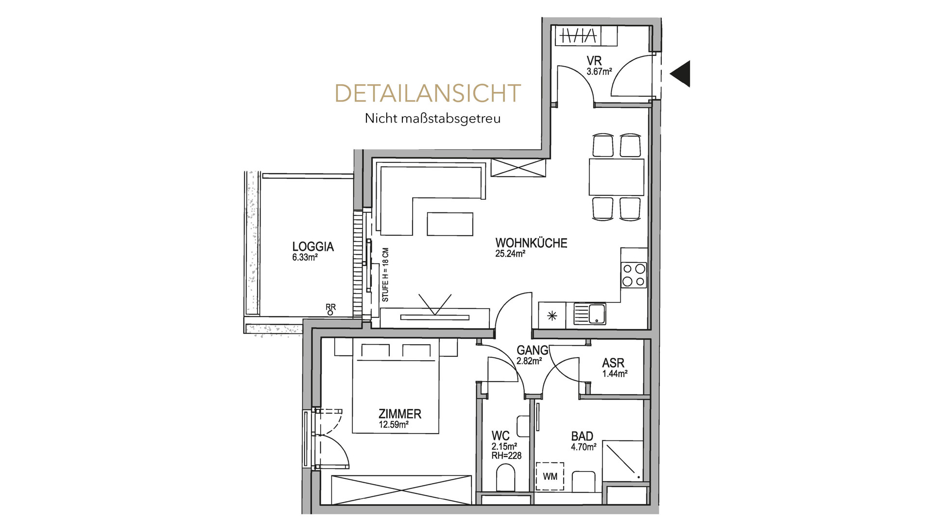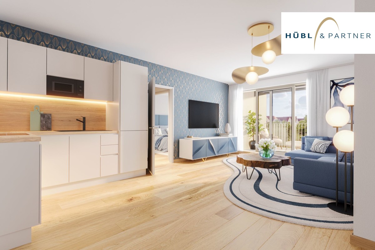Den zentralen Mittelpunkt der Wohnung bildet die helle Wohnküche, welche direkt mit der Loggia verbunden ist. Das Schlafzimmer ist als Ruhepol der Wohnung und als Ihr persönlicher Rückzugsort konzipiert. Das Badezimmer mit bodenebener Dusche und seinen hellen Feinsteinzeug-Fliesen ist ein Ort des Entspannens und Wohlbefindens. Eine separate Toilette sowie ein Abstellraum sorgen für noch mehr Komfort. Die Wohnung verbindet zeitgemäße, hochqualitative Ausstattung mit modernem Design. Ein wohltemperiertes Raumklima wird von der Bauteilaktivierung sichergestellt.