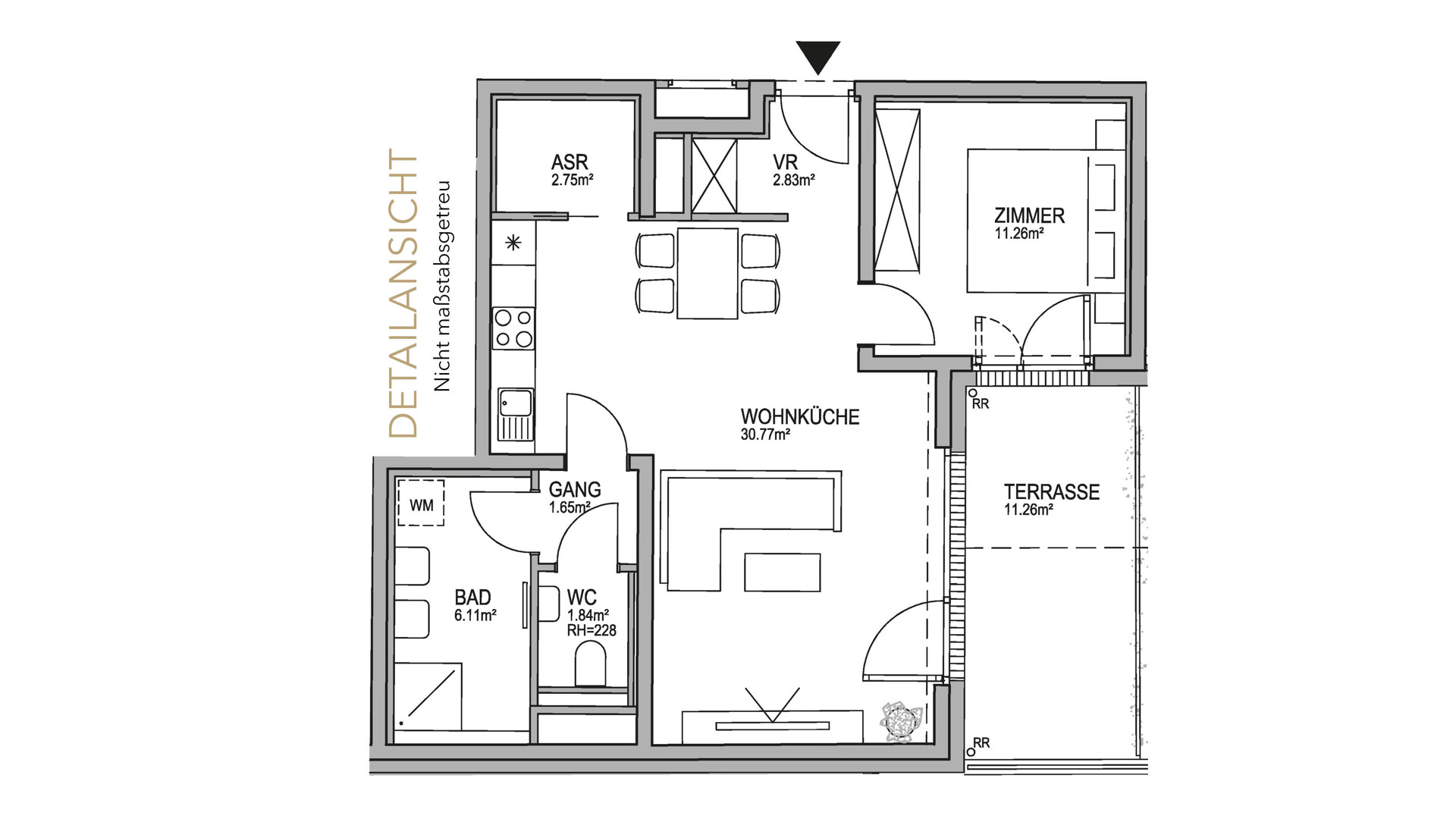 Den zentralen Mittelpunkt der Wohnung bildet die helle Wohnküche. Diese ist direkt mit der nach Süden ausgerichteten 11,26 m² großen Terrasse verbunden, welche in den ruhigen Innenhof des Wohnbauprojekts blickt. Das Schlafzimmer ist als Ruhepol der Wohnung und als Ihr persönlicher Rückzugsort konzipiert.