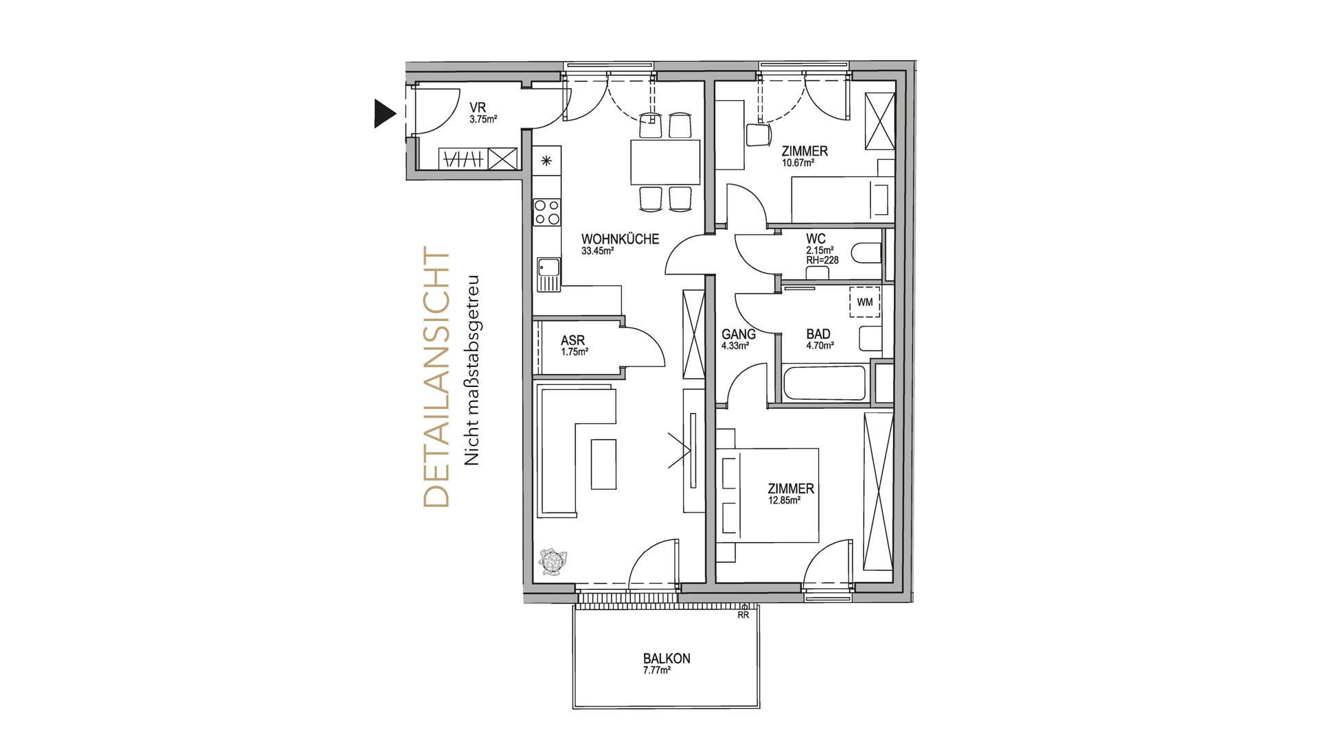Den zentralen Mittelpunkt der Wohnung bildet die helle Wohnküche. Diese ist direkt mit dem nach Westen ausgerichteten 7,77 m² großen Balkon verbunden, welcher in den ruhigen Innenhof des Wohnbauprojekts blickt. Das Wohnzimmer ist über einen Gang mit den beiden Schlafzimmern und dem Bad verbunden. Das Badezimmer mit seinen hellen Feinsteinzeug-Fliesen und der Badewanne ist ein Ort des Entspannens und Wohlbefindens. Eine separate Toilette sowie ein Abstellraum sorgen für noch mehr Komfort. Die Wohnung verbindet zeitgemäße, hochqualitative Ausstattung mit modernem Design. Ein wohltemperiertes Raumklima wird von der Bauteilaktivierung sichergestellt.