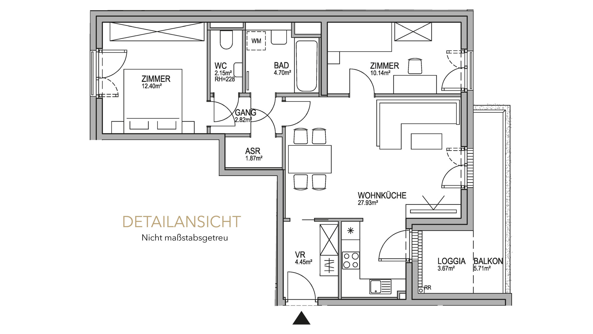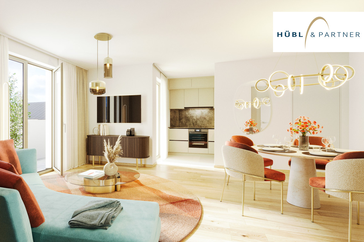 Den zentralen Mittelpunkt der Wohnung bildet die helle Wohnküche. Diese ist direkt mit der nach Süden ausgerichteten 9,38 m² großen Freifläche (Loggia & Balkon) verbunden. Die beiden Schlafzimmer sind als Ruhepol der Wohnung und als persönlicher Rückzugsort konzipiert. Das Badezimmer mit seinen hellen Feinsteinzeug-Fliesen und der Badewanne ist ein Ort des Entspannens und Wohlbefindens. Eine separate Toilette sowie ein Abstellraum sorgen für noch mehr Komfort. Die Wohnung verbindet zeitgemäße, hochqualitative Ausstattung mit modernem Design. Ein wohltemperiertes Raumklima wird von der Bauteilaktivierung sichergestellt.