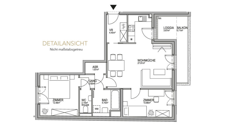 Den zentralen Mittelpunkt der Wohnung bildet die helle Wohnküche. Diese ist direkt mit der nach Süden ausgerichteten 9,38 m² großen Freifläche (Loggia & Balkon) verbunden. Die beiden Schlafzimmer sind als Ruhepol der Wohnung und als persönlicher Rückzugsort konzipiert. Das Badezimmer mit seinen hellen Feinsteinzeug-Fliesen und der Badewanne ist ein Ort des Entspannens und Wohlbefindens. Eine separate Toilette sowie ein Abstellraum sorgen für noch mehr Komfort. Die Wohnung verbindet zeitgemäße, hochqualitative Ausstattung mit modernem Design. Ein wohltemperiertes Raumklima wird von der Bauteilaktivierung sichergestellt.