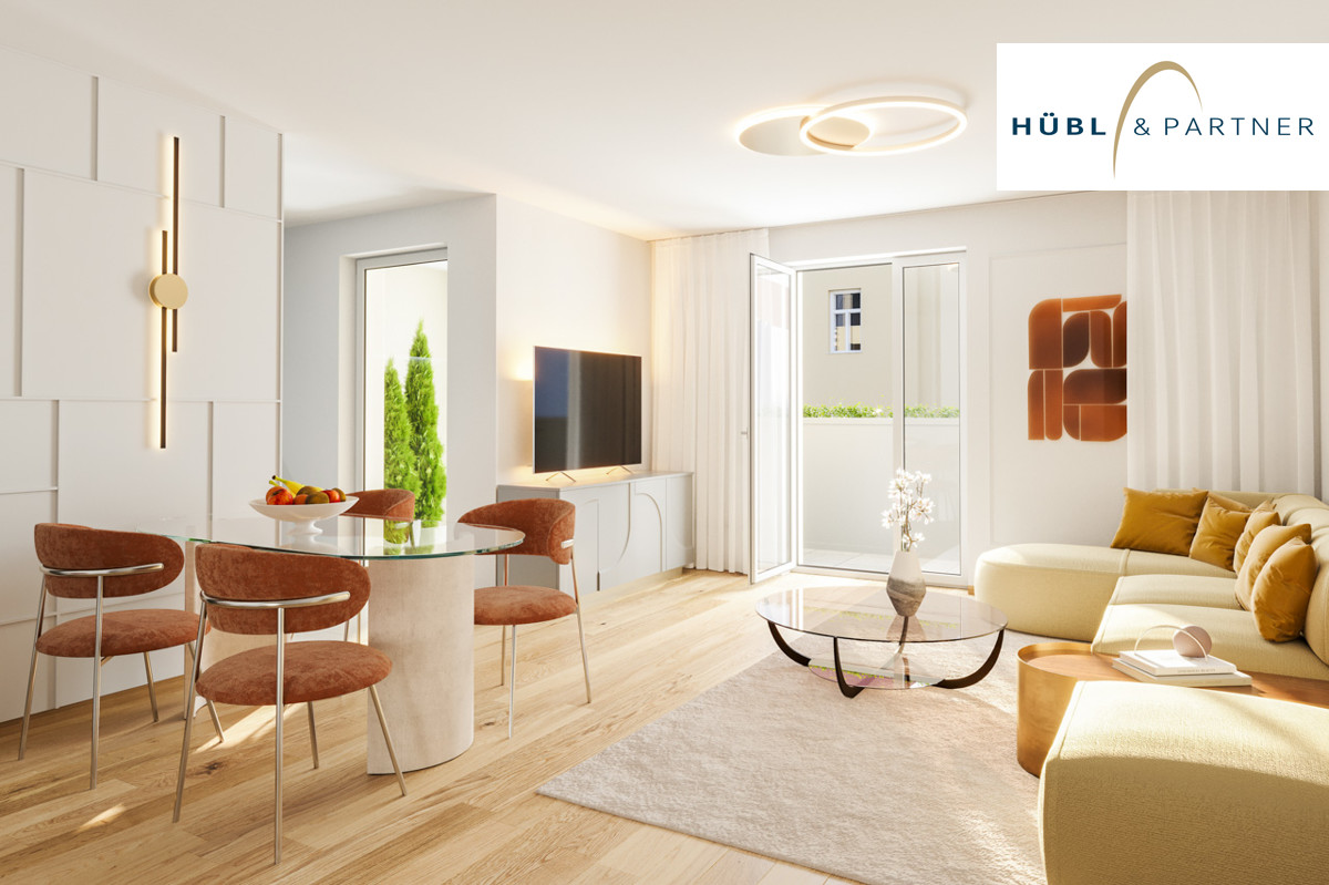 Den zentralen Mittelpunkt der Wohnung bildet die helle Wohnküche. Diese ist direkt mit der nach Süden ausgerichteten 9,38 m² großen Freifläche (Loggia & Balkon) verbunden. Die beiden Schlafzimmer sind als Ruhepol der Wohnung und als persönlicher Rückzugsort konzipiert. Das Badezimmer mit seinen hellen Feinsteinzeug-Fliesen und der Badewanne ist ein Ort des Entspannens und Wohlbefindens. Eine separate Toilette sowie ein Abstellraum sorgen für noch mehr Komfort. Die Wohnung verbindet zeitgemäße, hochqualitative Ausstattung mit modernem Design. Ein wohltemperiertes Raumklima wird von der Bauteilaktivierung sichergestellt.