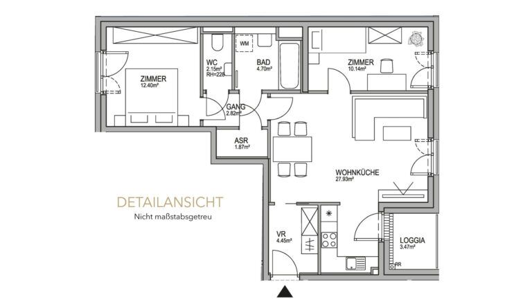 Den zentralen Mittelpunkt der Wohnung bildet die helle Wohnküche. Diese ist direkt mit der nach Süden ausgerichteten 3,47 m² großen Loggia verbunden. Die beiden Schlafzimmer sind als Ruhepol der Wohnung und als persönlicher Rückzugsort konzipiert. Das Badezimmer mit seinen hellen Feinsteinzeug-Fliesen und der Badewanne ist ein Ort des Entspannens und Wohlbefindens. Eine separate Toilette sowie ein Abstellraum sorgen für noch mehr Komfort. Die Wohnung verbindet zeitgemäße, hochqualitative Ausstattung mit modernem Design. Ein wohltemperiertes Raumklima wird von der Bauteilaktivierung sichergestellt.