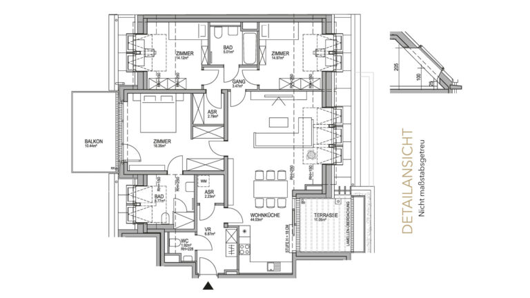 Der zentrale Mittelpunkt ist die sonnendurchflutete Wohnküche mit Zugang auf die südlich ausgerichtete 10 m² große Terrasse. Ein besonderes Highlight ist der große Master Bedroom mit Ausgang auf den 10 m² großen Balkon mit Blick in den ruhigen Innenhof der Wohnhausanlage sowie einem angrenzenden Bad mit bodenebener Dusche. An das Wohnzimmer grenzen zwei weitere großzügige und lichtdurchflutete Schlafzimmer mit einem gemeinsamen Wannenbad sowie einem Abstellraum. Ein einladender Vorraum dient als Verbindung zur Wohnküche, einem separierten Abstellraum und einer Gästetoilette. Ein wohltemperiertes Raumklima wird von der Bauteilaktivierung sichergestellt. Als zusätzlicher Komfort ist die Wohnung auch mit Klimageräten ausgestattet.