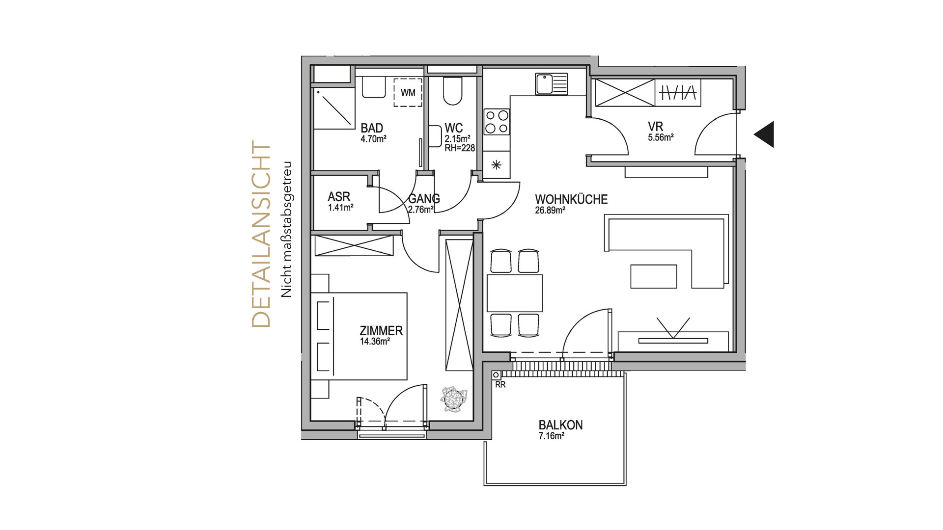 Den zentralen Mittelpunkt der Wohnung bildet die helle Wohnküche. Diese ist direkt mit dem nach Westen ausgerichteten 7,16 m² großen Balkon verbunden. Das Schlafzimmer ist als Ruhepol der Wohnung und als persönlicher Rückzugsort konzipiert. Das Badezimmer mit bodenebener Dusche und seinen hellen Feinsteinzeug-Fliesen ist ein Ort des Entspannens und Wohlbefindens. Eine separate Toilette sowie ein Abstellraum sorgen für noch mehr Komfort. Für ein wohltemperiertes Raumklima sorgt die Bauteilaktivierung. Die Wohnung verbindet zeitgemäße, hochqualitative Ausstattung mit modernem Design.