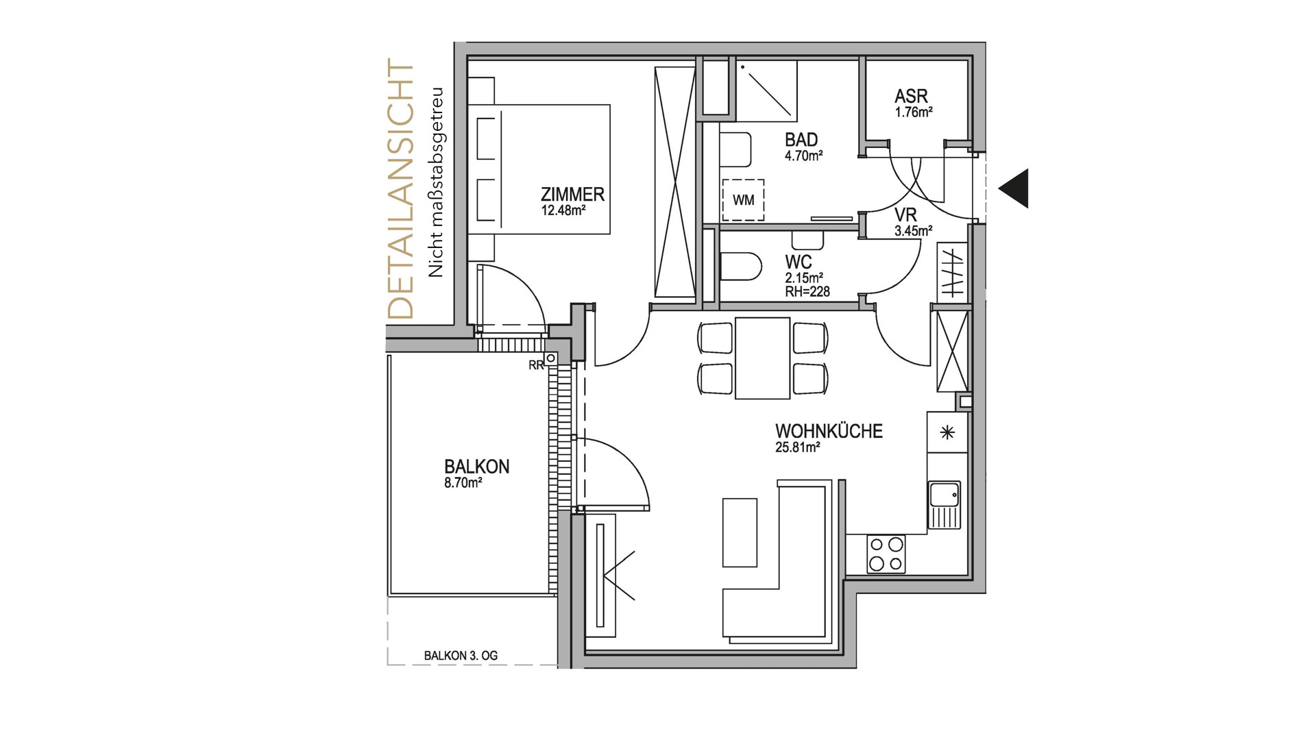 Den zentralen Mittelpunkt der Wohnung bildet die helle Wohnküche. Diese ist direkt mit dem nach Nord-West ausgerichteten 8,70 m² großen Balkon verbunden. Das Schlafzimmer ist als Ruhepol der Wohnung und als persönlicher Rückzugsort konzipiert. Das Badezimmer mit bodenebener Dusche und seinen hellen Feinsteinzeug-Fliesen ist ein Ort des Entspannens und Wohlbefindens. Eine separate Toilette sowie ein Abstellraum sorgen für noch mehr Komfort. Für ein wohltemperiertes Raumklima sorgt die Bauteilaktivierung. Die Wohnung verbindet zeitgemäße, hochqualitative Ausstattung mit modernem Design.
