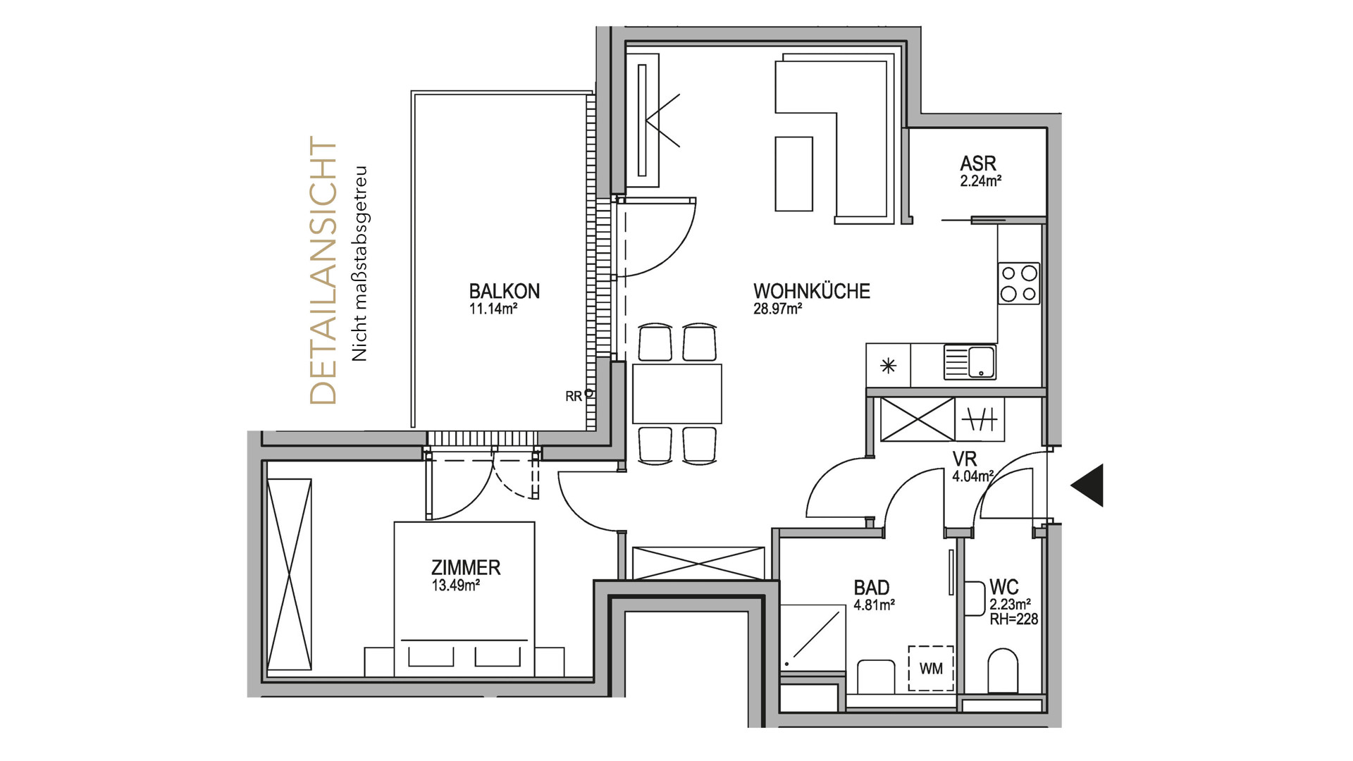 Den zentralen Mittelpunkt der Wohnung bildet die helle Wohnküche. Diese ist direkt mit dem nach Nord-Ost ausgerichteten 11,14 m² großen Balkon verbunden, welcher in den ruhigen Innenhof des Wohnbauprojekts blickt. Das Schlafzimmer ist als Ruhepol der Wohnung und als persönlicher Rückzugsort konzipiert. Das Badezimmer mit bodenebener Dusche und seinen hellen Feinsteinzeug-Fliesen ist ein Ort des Entspannens und Wohlbefindens. Eine separate Toilette sowie ein Abstellraum sorgen für noch mehr Komfort. Für ein wohltemperiertes Raumklima sorgt die Bauteilaktivierung. Die Wohnung verbindet zeitgemäße, hochqualitative Ausstattung mit modernem Design.