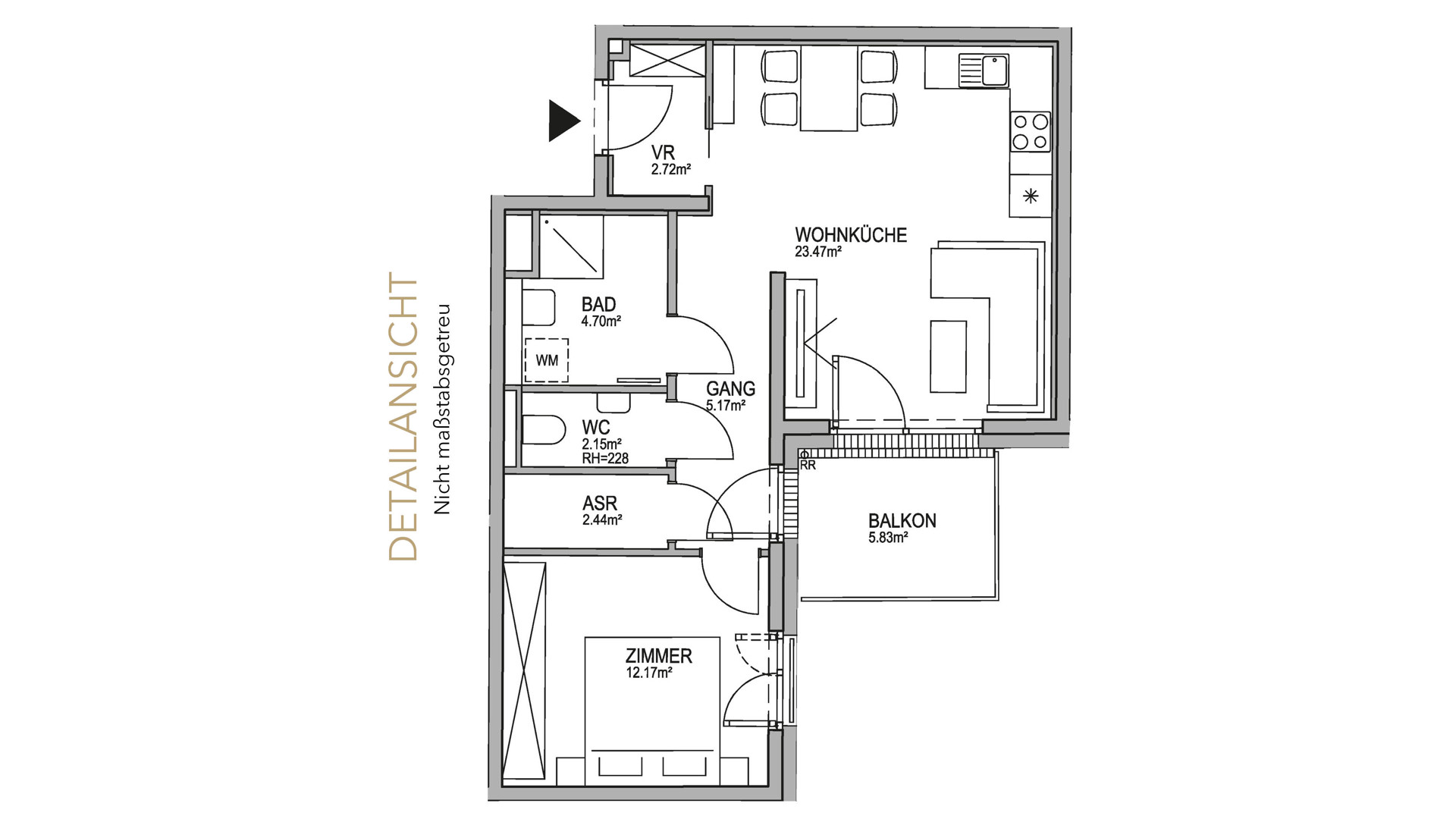 Den zentralen Mittelpunkt der Wohnung bildet die helle Wohnküche. Diese ist direkt mit dem nach Westen ausgerichteten 5,83 m² großen Balkon verbunden, welcher in den ruhigen Innenhof des Wohnbauprojekts blickt. Das Schlafzimmer ist als Ruhepol der Wohnung und als persönlicher Rückzugsort konzipiert. Das Badezimmer mit bodenebener Dusche und seinen hellen Feinsteinzeug-Fliesen ist ein Ort des Entspannens und Wohlbefindens. Eine separate Toilette sowie ein Abstellraum sorgen für noch mehr Komfort. Die Wohnung verbindet zeitgemäße, hochqualitative Ausstattung mit modernem Design. Ein wohltemperiertes Raumklima wird von der Bauteilaktivierung sichergestellt.