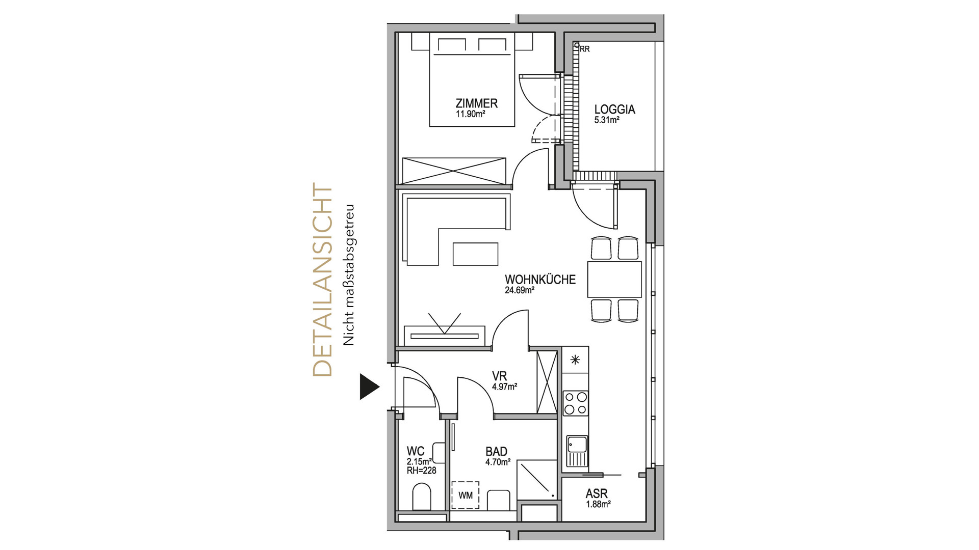 Den zentralen Mittelpunkt der Wohnung bildet die helle Wohnküche. Diese ist direkt mit der nach Süden ausgerichteten 5,31 m² großen Loggia verbunden. Das Schlafzimmer ist als Ruhepol der Wohnung und als persönlicher Rückzugsort konzipiert. Das Badezimmer mit bodenebener Dusche und seinen hellen Feinsteinzeug-Fliesen ist ein Ort des Entspannens und Wohlbefindens. Eine separate Toilette sowie ein Abstellraum sorgen für noch mehr Komfort. Für ein wohltemperiertes Raumklima sorgt die Bauteilaktivierung. Die Wohnung verbindet zeitgemäße, hochqualitative Ausstattung mit modernem Design.