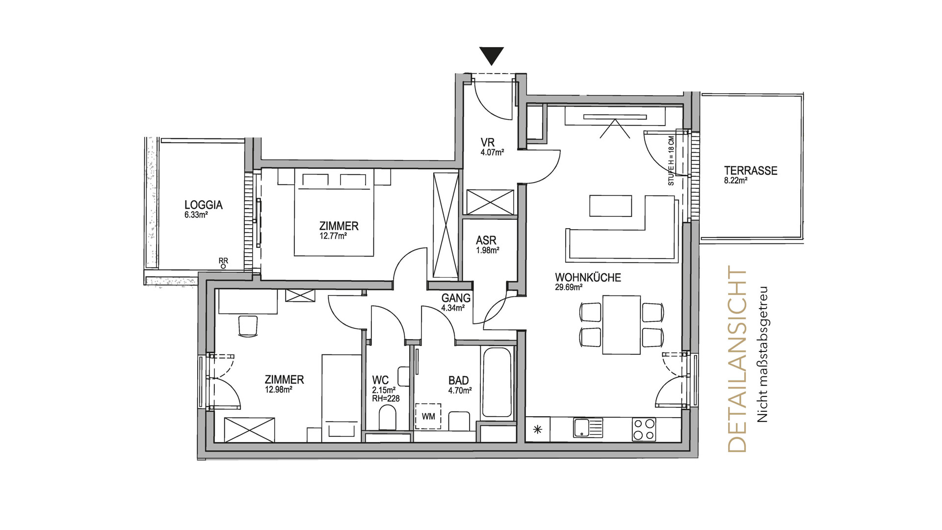 Den zentralen Mittelpunkt der Wohnung bildet die helle Wohnküche, welche direkt mit der nach Süden ausgerichteten 8,22 m² großen Terrasse verbunden ist. Ein besonderes Highlight ist der Master Bedroom mit der eigenen Loggia und dem direkten Blick in den Park. Beide Schlafzimmer sind als Ruhepol der Wohnung und als persönlicher Rückzugsort konzipiert. Das Badezimmer mit seinen hellen Feinsteinzeug-Fliesen und der Badewanne ist ein Ort des Entspannens und Wohlbefindens. Eine separate Toilette sowie ein Abstellraum sorgen für noch mehr Komfort. Die Wohnung verbindet zeitgemäße, hochqualitative Ausstattung mit modernem Design. Ein wohltemperiertes Raumklima wird von der Bauteilaktivierung sichergestellt.