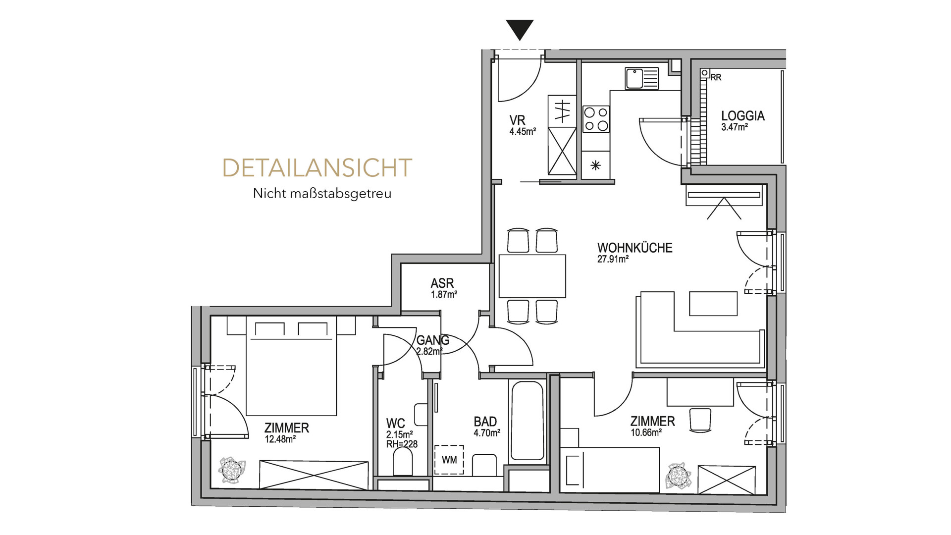 Den zentralen Mittelpunkt der Wohnung bildet die helle Wohnküche. Diese ist direkt mit der nach Süden ausgerichteten 3,47 m² großen Loggia verbunden. Die beiden Schlafzimmer sind als Ruhepol der Wohnung und als persönlicher Rückzugsort konzipiert. Das Badezimmer mit seinen hellen Feinsteinzeug-Fliesen und der Badewanne ist ein Ort des Entspannens und Wohlbefindens. Eine separate Toilette sowie ein Abstellraum sorgen für noch mehr Komfort. Für ein wohltemperiertes Raumklima sorgt die Bauteilaktivierung. Die Wohnung verbindet zeitgemäße, hochqualitative Ausstattung mit modernem Design.